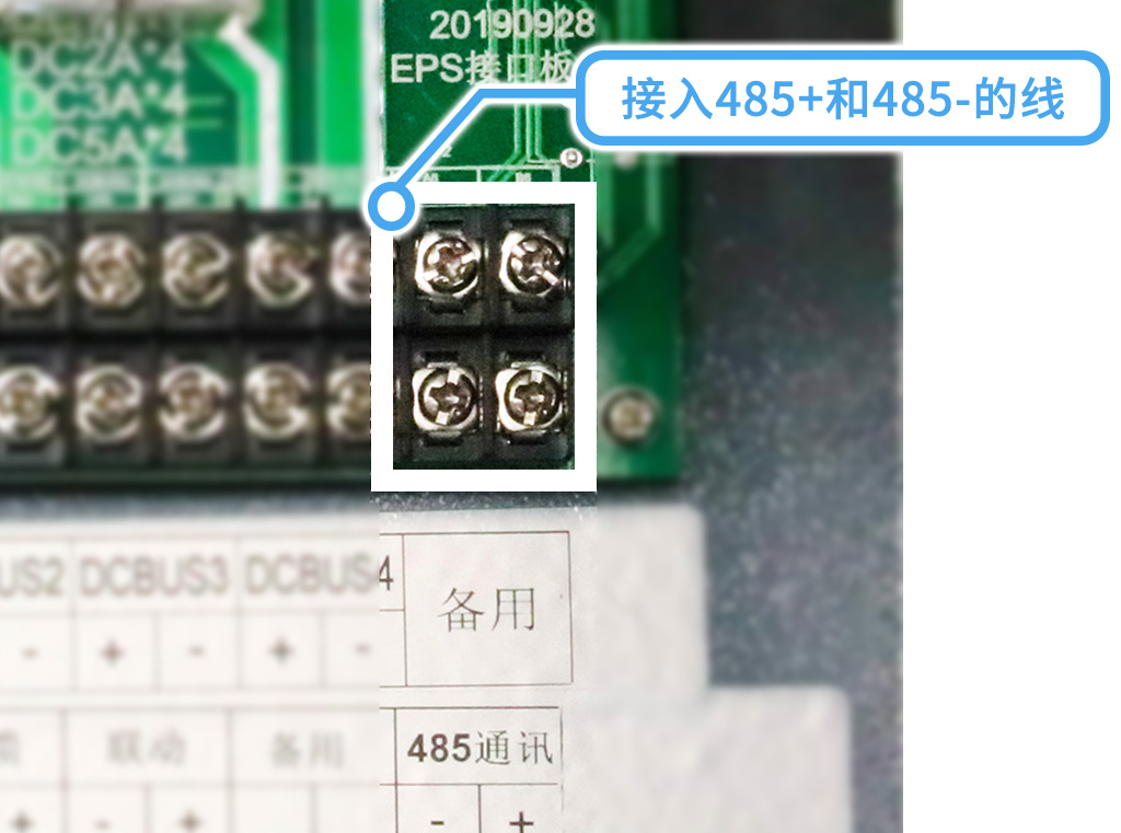 通信部分的主機通信:在以下2個端口接入485+(正)和485-(負)的線,注意不要接反;
